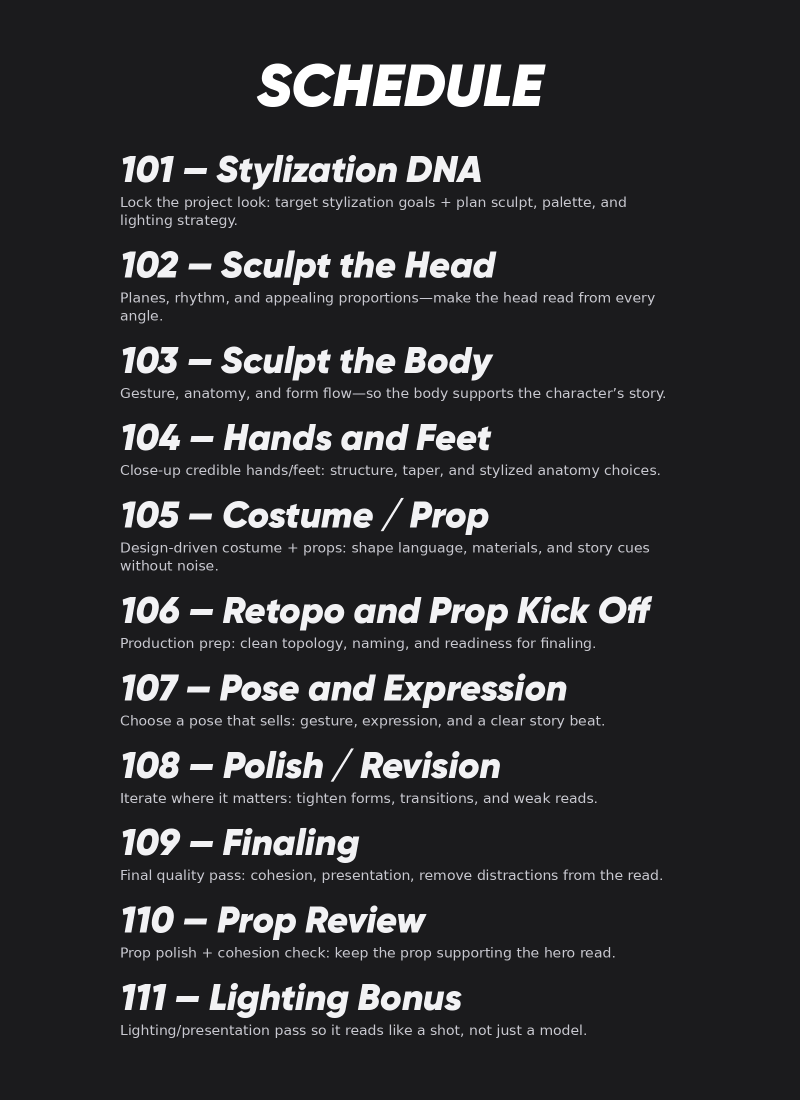 An 8-week, studio-style sprint that turns “almost there” into portfolio-ready—with clear targets, high-impact design fixes, and lighting/key art that sells the character.Week 1: Triage + fix-list (sculpt, costume, pose, expression) + focused reference plan