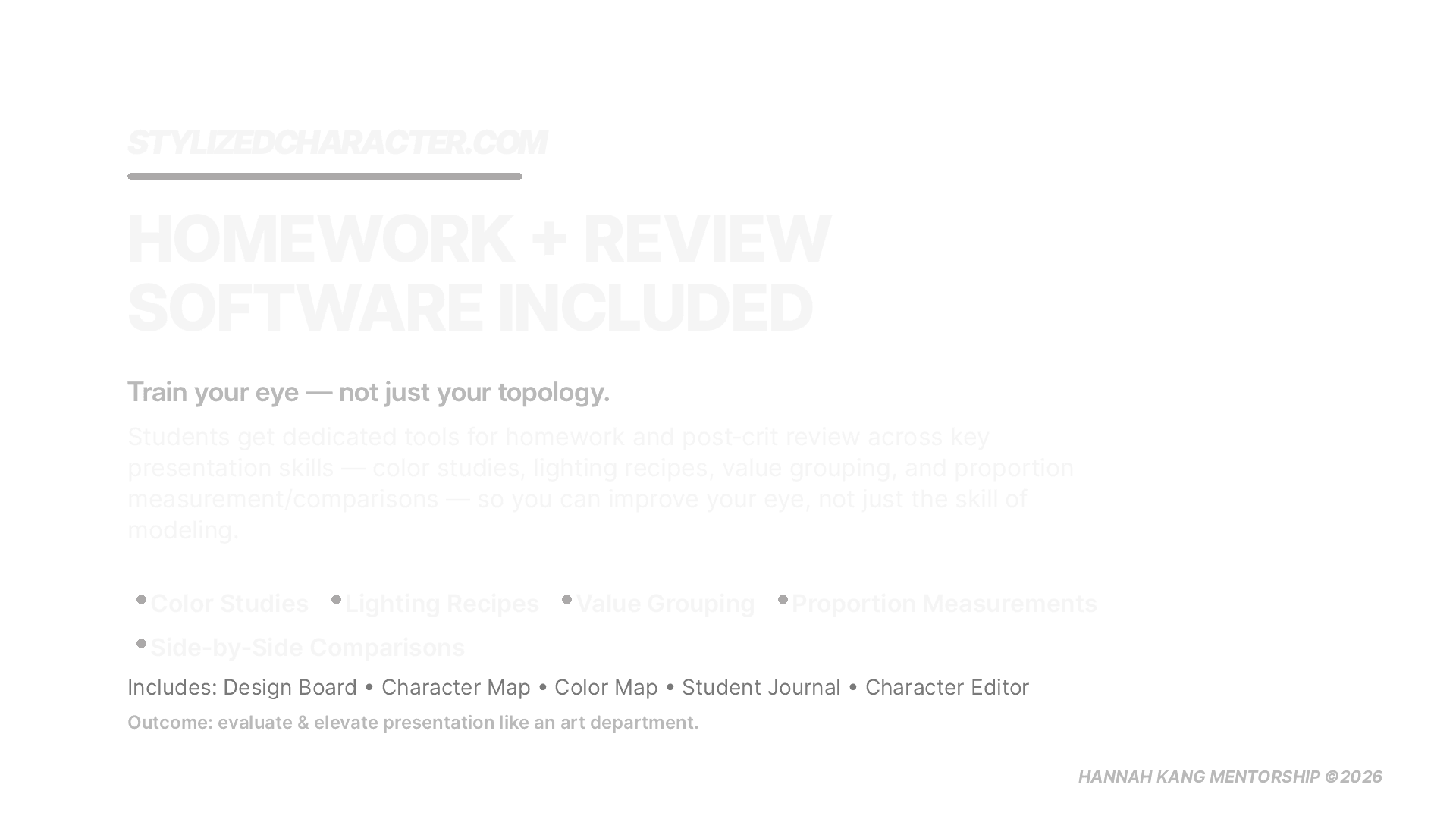 Software + tools setup — color theory helpers, character concept and prep tools, stylization targets, and systems to keep you creating beyond the mentorship